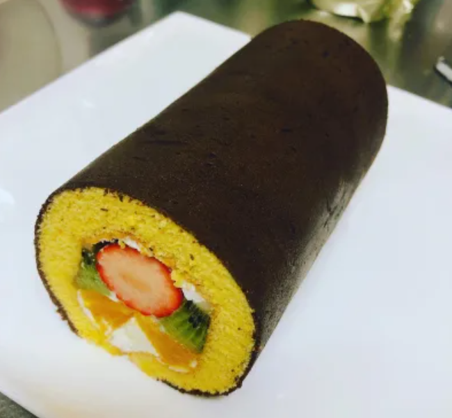 ふんわりしたココアスポンジで、色とりどりのフルーツとクリームを巻いた見た目も華やかなロールケーキなんです。