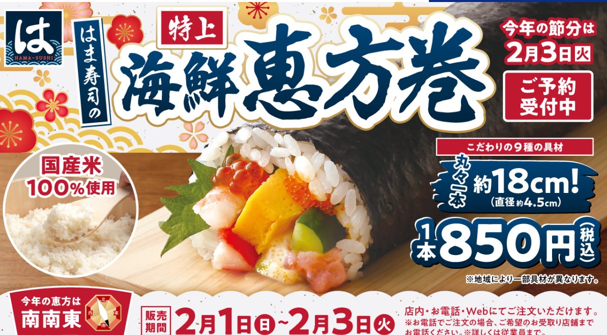 2026年1月13日時点では、はま寿司から公式な恵方巻の販売情報はまだ発表されていません。
